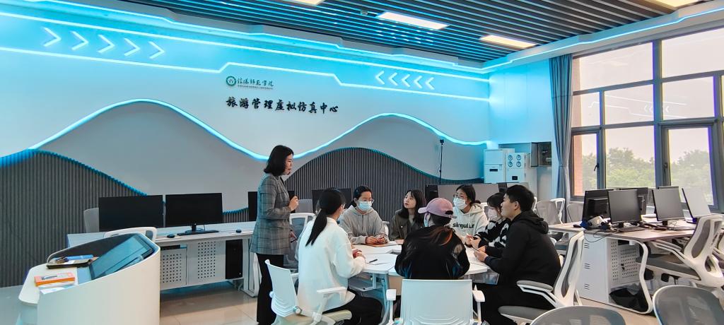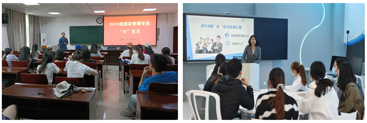 “云导览”观摩的基础上,指导教师围绕见习主题组织学生进行现场讨论,精彩纷呈的见习内容极大的激发了同学们的参与热情,现场气氛热烈。此外,同学们在完成“云导览”认知见习后,按专业分小组至旅游虚拟仿真中心、酒店管理实训中心践行职业模拟演练,与见习单位指导教师直接联系,就见习内容进行一对一指导,实现“云互动”。