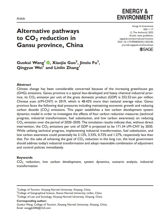 太阳成集团tyc9728王国奎博士在SSCI刊物《Energy & Environment》上发表题为“Alternative pathways to CO2 reduction in Gansu province, China”的学术论文。