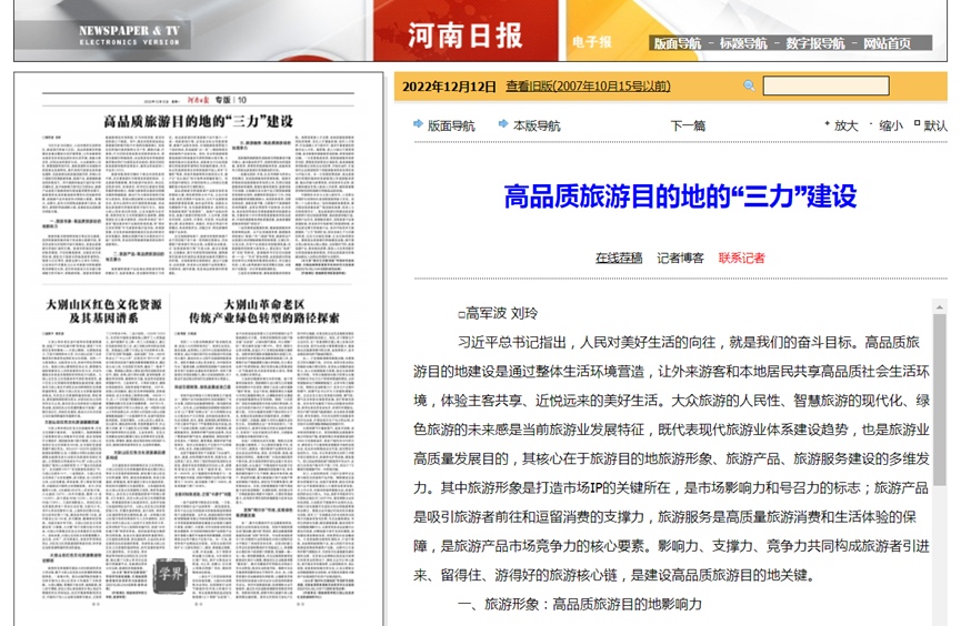 我院高军波教授、刘玲博士分别在《中国旅游报》和《河南日报》上发表理论文章。《用平台思维构筑民宿行业共利共赢生态圈》发表在中国旅游报2022年9月14日第4版,《高品质旅游目的地的“三力”建设》发表于该河南日报2022年12月12日第10版。