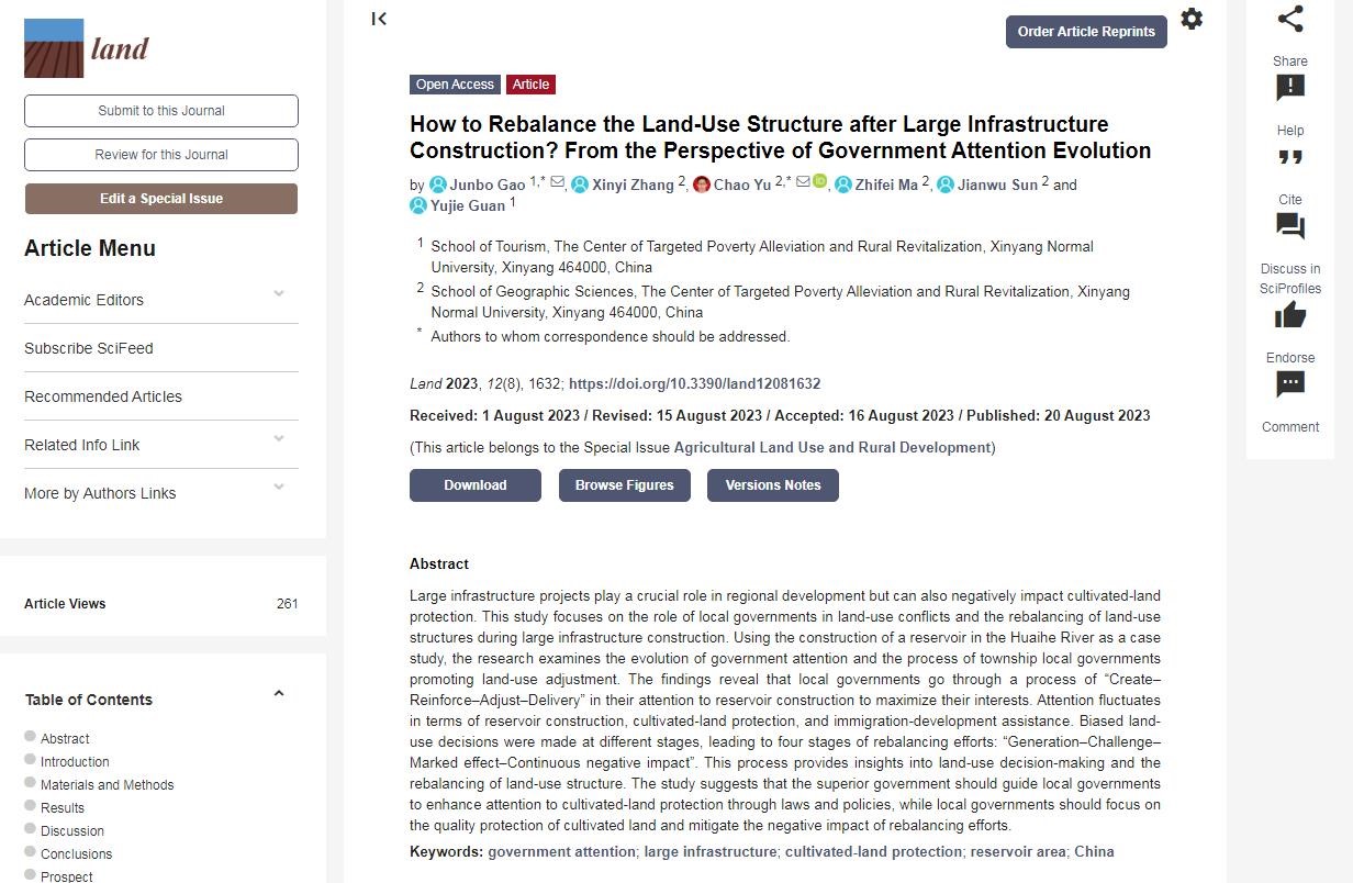 近日,太阳成集团tyc9728高军波教授团队在SSCI期刊《land》(2022年影响因子:3.905,JCR分区Q2)发表了题为《How to Rebalance the Land-Use Structure after Large Infrastructure Construction? From the Perspective of Government Attention Evolution》的论文。