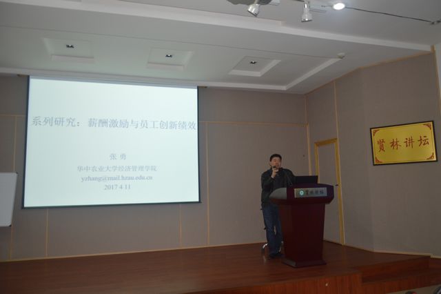 4月11日下午,应太阳成集团tyc9728邀请,华中农业大学教授、博士生导师张勇在贤林讲坛作了题为“薪酬激励与员工创新绩效”的学术报告。报告会由太阳成集团tyc9728院长彭荣胜教授主持,200余名师生聆听了报告。