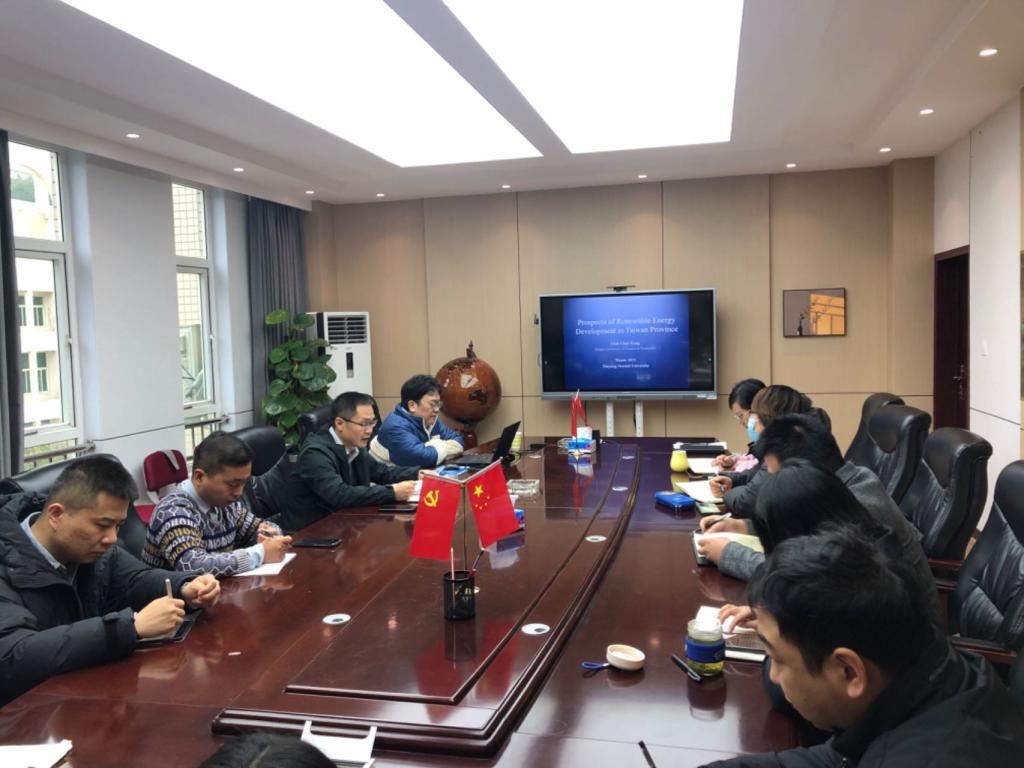 宫教授的报告主要围绕废核背景下台湾可再生能源结构调整、台湾可再生能源的类型及其潜力、发展可再生能源如何改善台湾的能源安全和能源结构、可再生能源推广过程中的影响因素等展开,并重点就生物能源、太阳能和风能进行举例说明。提问环节,宫教授与我院教师进行了互动交流,就大家提出的相关问题给予了认真详细的解答。