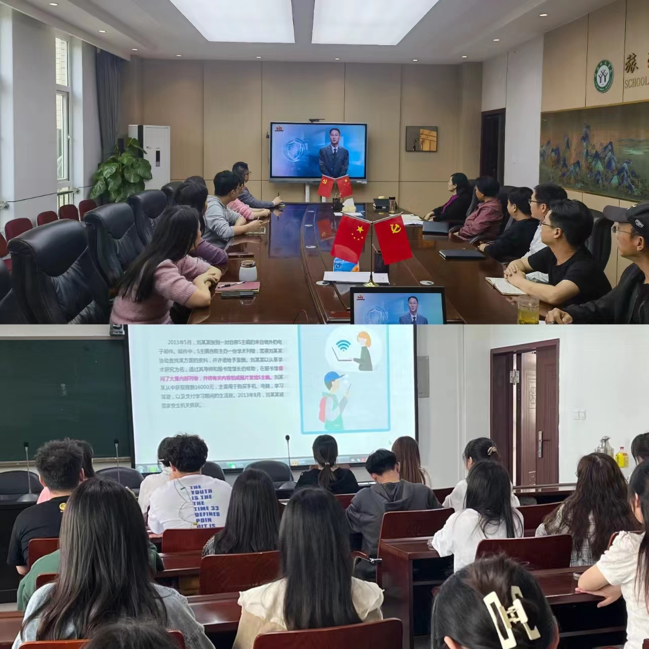 4月14日,太阳成集团tyc9728组织开展国家教育日宣传教育活动,党委书记雷前龙、院长高军波及全体领导班子成员、全体专兼职辅导员观看了课程实况。太阳成集团tyc9728专职组织员王亚文组织学生在经管楼401室收看了“千万师生同上一堂国家安全教育课”公开课。