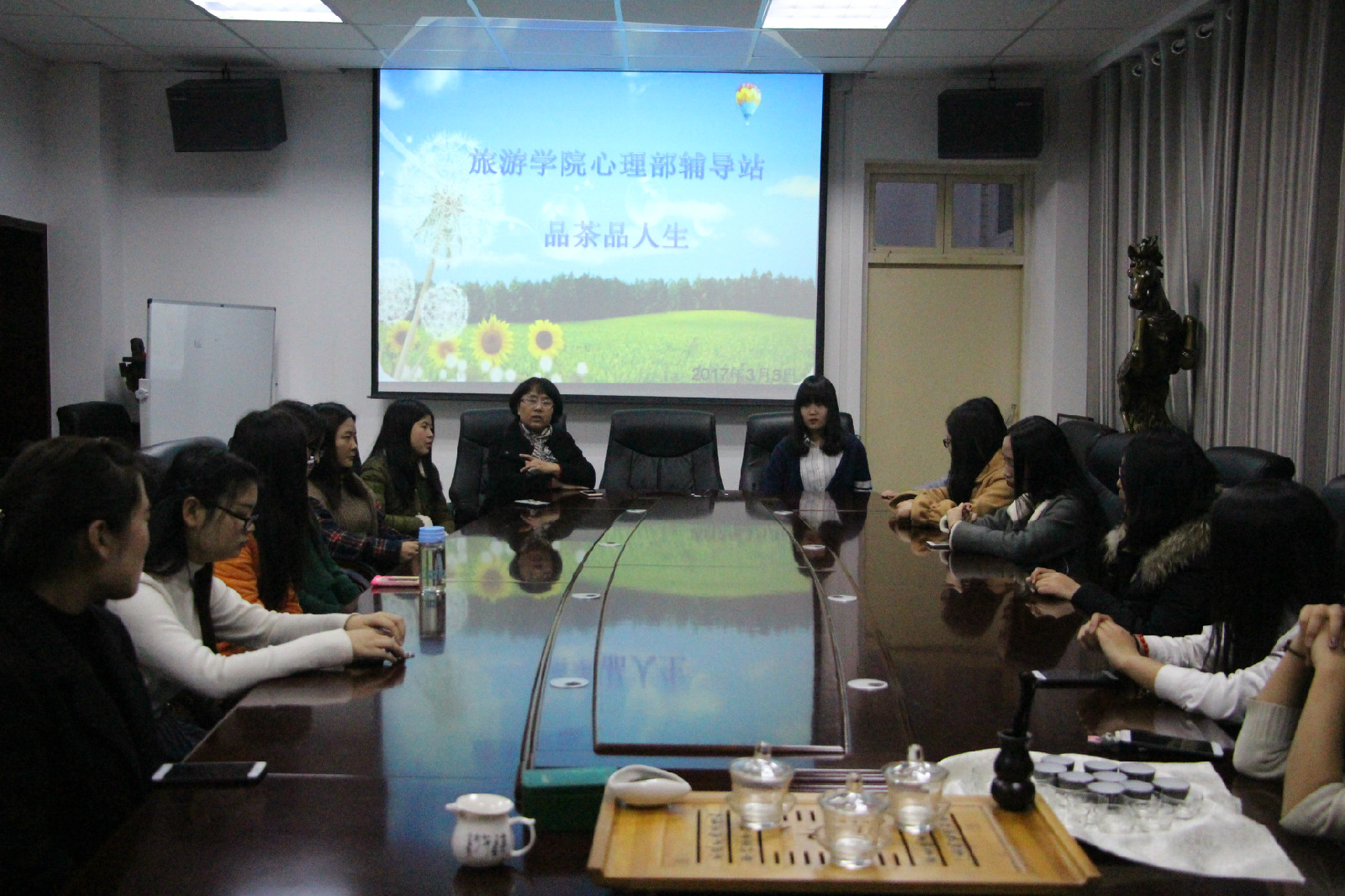 为了弘扬我国茶文化,加深学子对茶文化的认识,3月3日晚,太阳成集团tyc9728心理部辅导站“品茶品人生”茶文化讲座在经管楼会议室举行。我院党委副书记张晓峰,团委书记杨鑫,心理辅导员路璐与10余名学生代表共同参与此次会议。