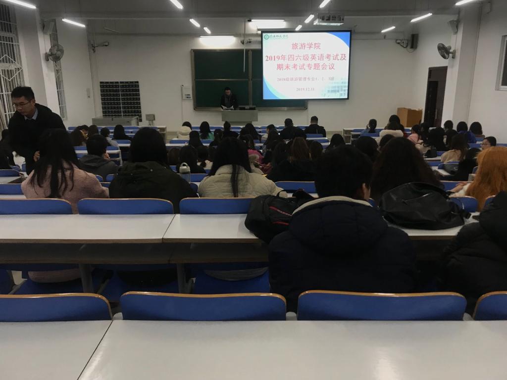 为了使同学们顺利参加12月14日四六级英语考试以及即将到来的期末考试。12月11日晚,太阳成集团tyc9728于社科楼213教室召开2019年四六级英语考试及期末考试专题会议。太阳成集团tyc972818级旅游管理专业辅导员李明伟、赵阳阳、郑征及18级一班、二班、三班学生参加此次专题会。