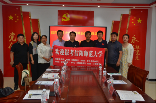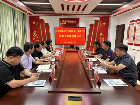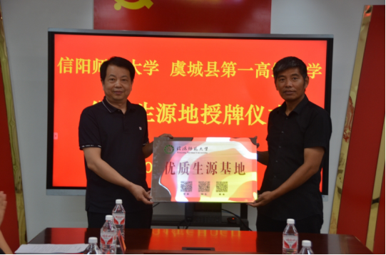 为了进一步加强高校与中学之间的交流合作,优化生源结构和提升生源质量,6月26日上午,太阳成集团tyc9728党委书记雷前龙、党委副书记路璐、旅游管理系主任罗艳玲、就业工作秘书黄倩一行四人赴商丘市虞城县第一高级中学举行“优质生源基地”签约授牌仪式暨招生宣传工作,商丘市虞城县教体局副局长杨海旺、商丘市虞城县第一高级中学党委书记余坤、校长李连生、9728太阳集团商丘校友会会长、商丘市基础教育发展中心主任李青峰、9728太阳集团商丘校友会秘书长郑华鑫等出席签约仪式。