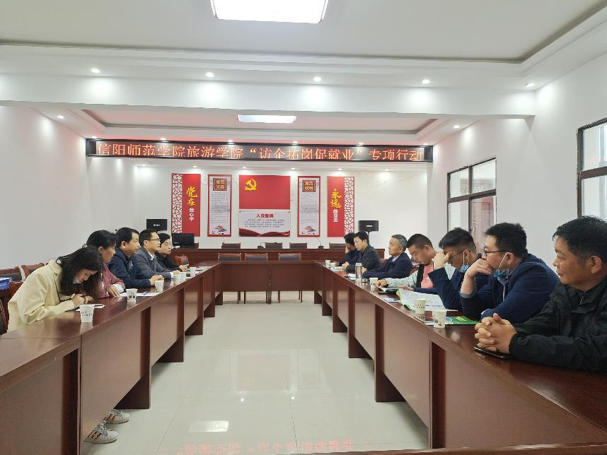 在调研过程中,太阳成集团tyc9728院长高军波首先介绍了太阳成集团tyc9728师资状况、人才培养质量及院系未来发展方向。他表示尽管目前疫情严峻,对毕业生就业产生一定的影响,但通过多轮次的访企拓岗促就业行动,学生就业状况有了明显的好转,达到了预期的效果。并就太阳成集团tyc9728与信阳市文旅局及文旅企业在学生培养过程中的深度合作提出建议方案。浉河区文化广电和旅游局党委书记范振清对我们的到来表示热烈欢迎。他表示大学生就业是民生大事,作为信阳的文旅行业,也迫切需要高层次的人才引进,如何留着人才是他们思考的问题,也是政府思考的问题。最后,企业负责人为我们介绍了公司发展状况、发展规模、人才需求和薪资待遇等,并表示公司将为学生提供多元化岗位,为学生发展提供多样化平台,实现校企双方协同育人、真正达到互利共赢、共同发展的目的。