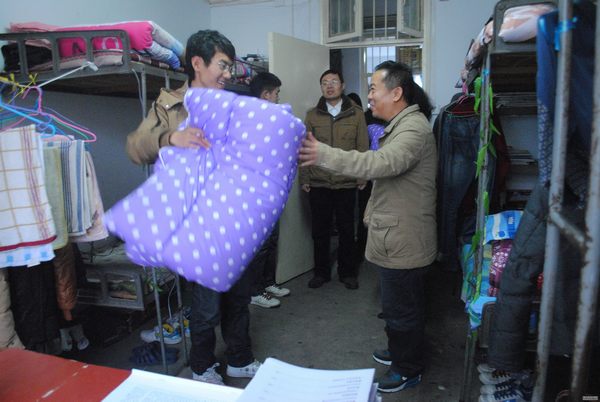 在学生宿舍里,曹明贵院长一行与同学们进行了亲切交谈,热情询问了同学们的学习、生活状况,并针对同学们在日常生活中遇到的困难与问题提出切实可行的建议和细致周到的解决办法,对安全用电、防火防盗等安全问题提出具体的指导意见。随后,曹明贵院长一行将棉被送至贫困学生手中,希望同学们把学校当作自己的家,把师生当作自己的亲人,积极反映问题和困难,学校和学院一定会尽最大的努力帮助他们渡过难关。