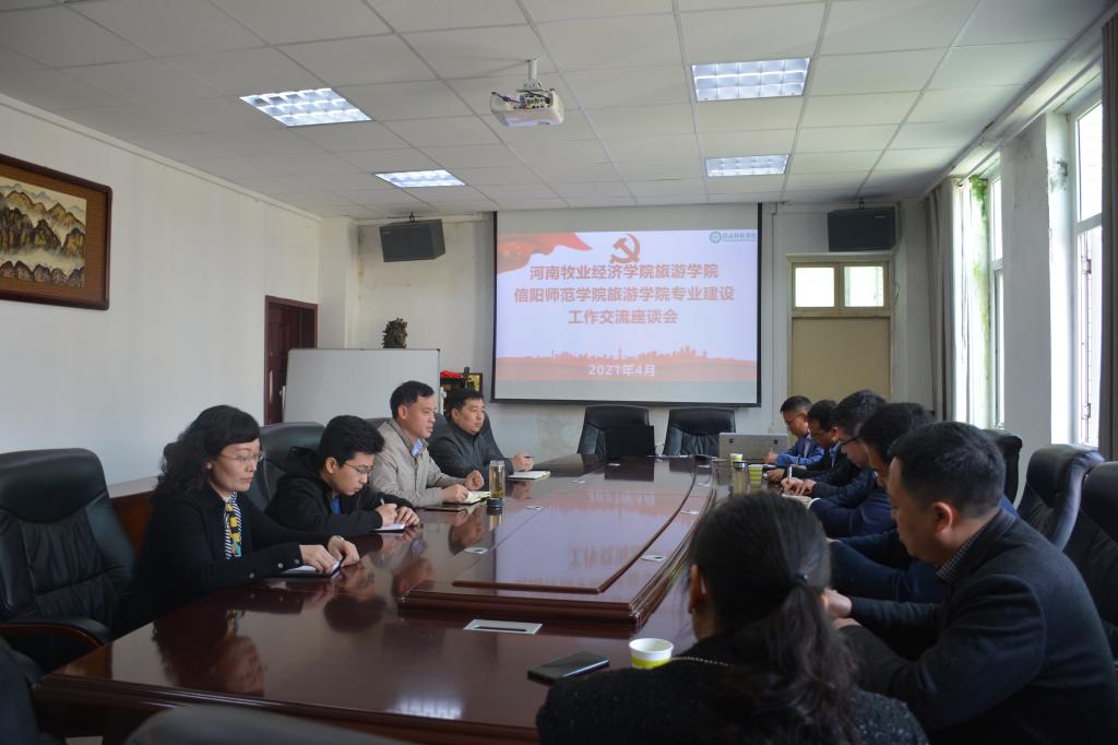 2021年4月11日,河南牧业经济学院旅游学院院长王德静、书记李喜民一行7人,来我校旅游学院进行专业建设调研交流,我校旅游学院院长彭荣胜、副院长郭军升、旅游系系主任吴国琴、酒店系系主任江晓晗一同出席了专业建设交流会。