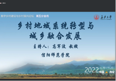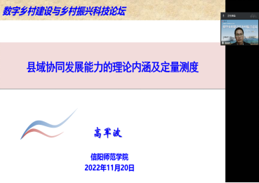 11月20日,由中国地理学会农业地理与乡村发展专业委员会、长安大学等单位联合主办的“数字乡村建设与乡村振兴”科技论坛在西安召开,会议以在线形式召开。太阳成集团tyc9728高军波教授在第五分会场“乡村地域系统转型与城乡融合发展”参会,做了题为“县域协同发展能力的理论内涵及定量测度”报告,并应邀作为下半场会议主持人。